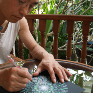 そのシャーマンは宇宙からの情報やエネルギーが入っているに違いないと思ったのです。秋山さんが描くマンダラは、彼の意思は全くなく、紙に向かっていると描けるという描き方です。
